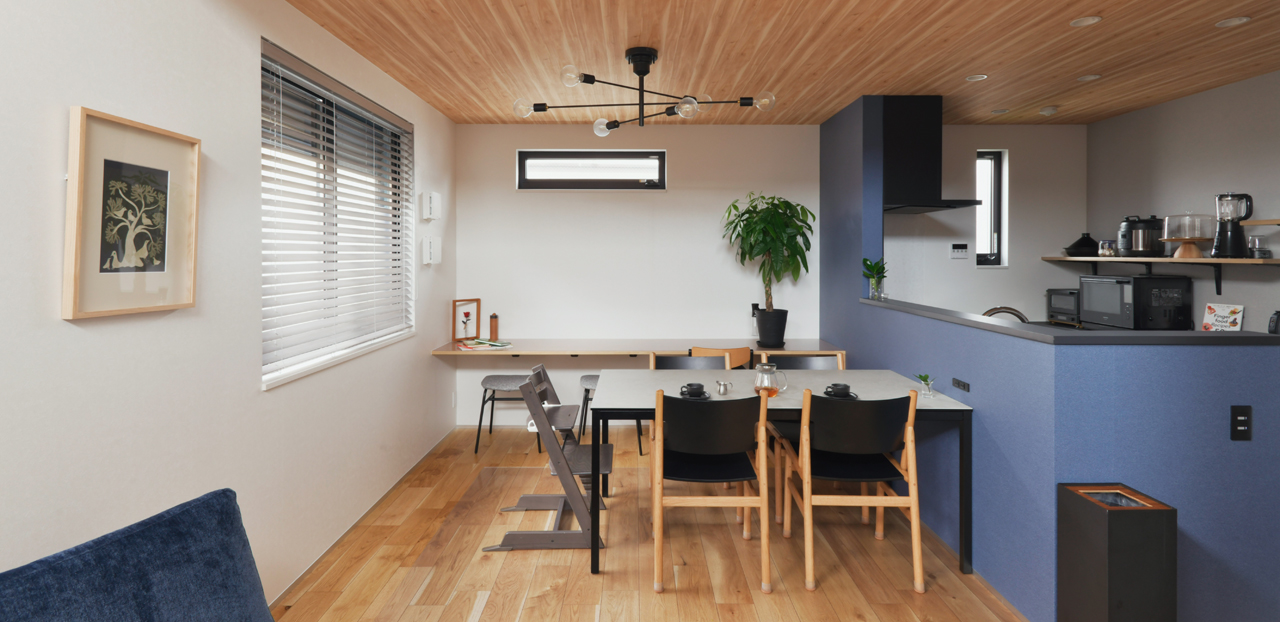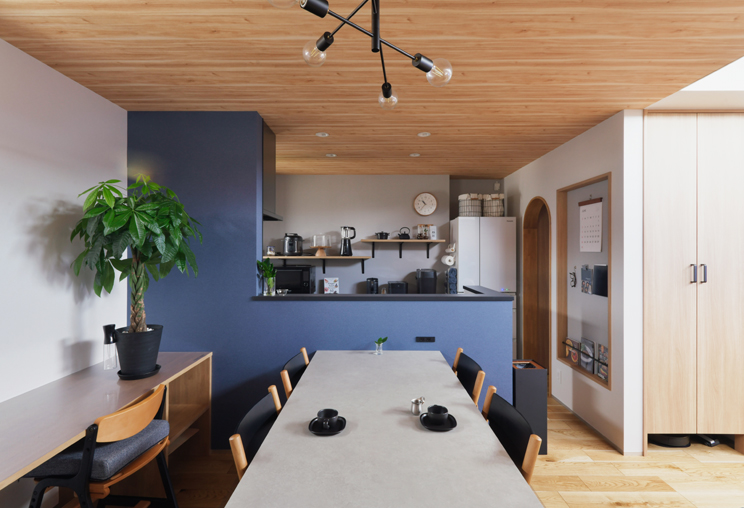 ネイビーとグレーを基調とした「落ち着きのあるダイニング・キッチン」という異なる2つの表情。