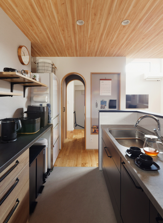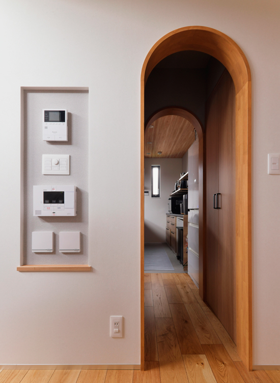 ケーキの型だけでも数十個。そんなたくさんのキッチン道具を収めるため、Rの垂れ壁の奥に大容量のパントリーを設けた。アーチを木で縁取るアイデアは、お施主さま自身のもの。赤秀さんも「センスの証ですね」と感心した、こだわりのディテール