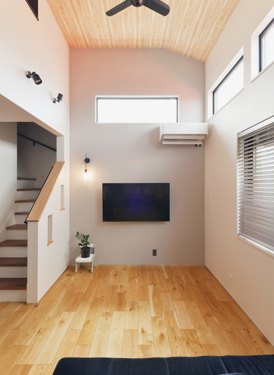 開放感あふれる吹き抜けのリビング。一日を通して、最も心地よい自然光が部屋の奥まで届くように。建築士と何度もシミュレーションを重ね、高窓の数や配置を慎重に決めていった。計算し尽くされた設計が、空間に圧倒的な明るさと広がりをもたらしている