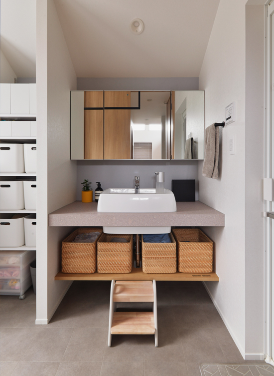 スペースを無駄なく活用した造作の洗面台。手持ちのバスケットがぴったり収まるよう、棚の高さまで計算されている。すっきり片付くだけでなく、日々の整理整頓がぐっと楽になり、キレイな状態を維持しやすい