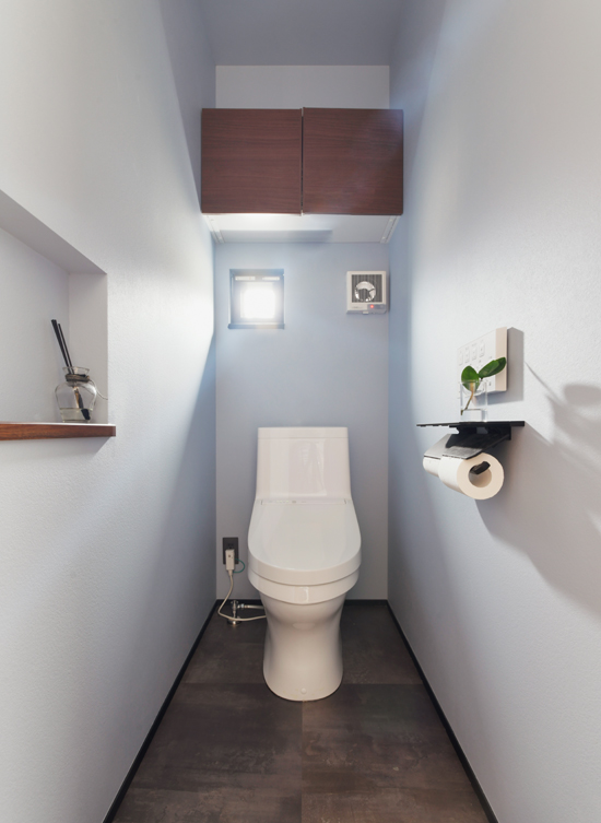 トイレの壁には、心を落ち着かせる、空のような淡いブルーのクロスを。暗くなりがちなトイレ空間も、この爽やかなブルーと、窓から差し込む自然光のおかげで、明るく清潔感のある雰囲気に。壁に設けたニッチや、木目調の吊り戸棚が、シンプルな空間に温かみを添えている
