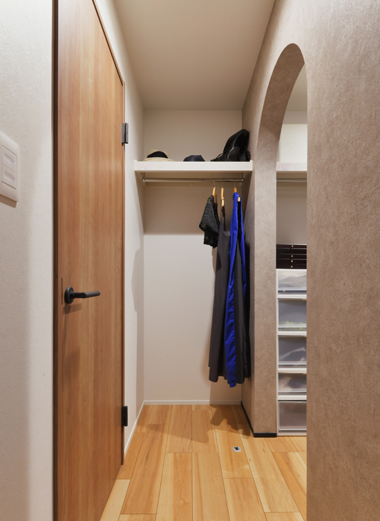 ウォークインクローゼットの入口にも、この家のモチーフであるRアーチを採用。約2畳の空間には、家族の衣類はもちろん、季節の荷物などもしまえる十分な広さを確保。デザインの統一感が、家全体の完成度を高めている
