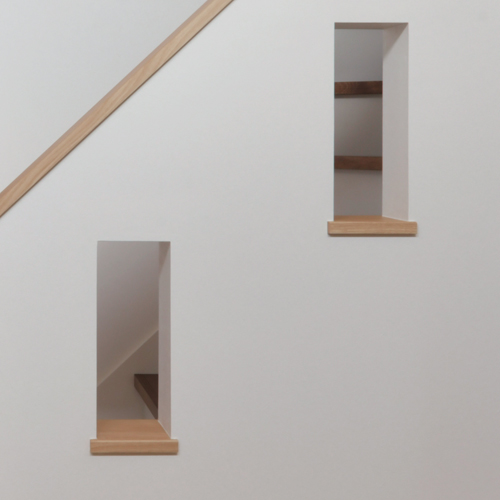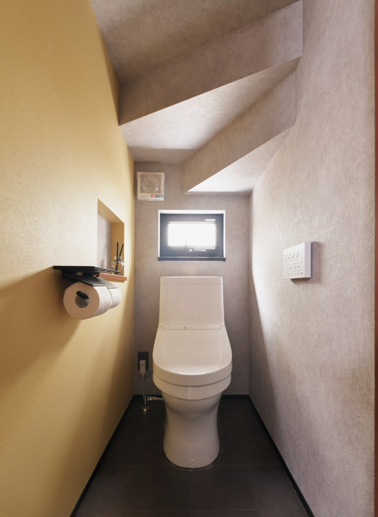 階段下のスペースを有効活用したトイレ。むき出しの階段の裏側が、そのまま空間のデザインの一部になっているのがユニークだ。壁は優しいイエローとグレーでコーディネートされ、コンパクトながらも温かみのある空間に