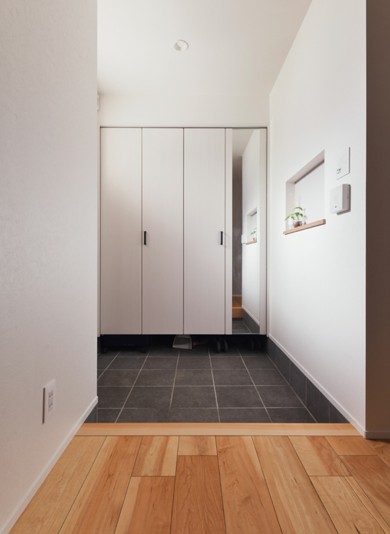 玄関には壁と一体化した大容量の壁面収納を。靴はもちろん、こまごまとした物もすべて扉の向こうに隠すことで、いつでもすっきりとした空間を保てる。壁に設けた小さなニッチが、季節のしつらえを楽しむ余白を生んでいる