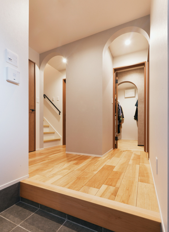 玄関からの眺めを印象的にする、左右対称に並んだ2つのRアーチ。左は2階のパブリックスペースへ、右はプライベートな空間へと、それぞれ違う場所へつながる。毎日通る場所だからこそ、ドラマチックな演出を