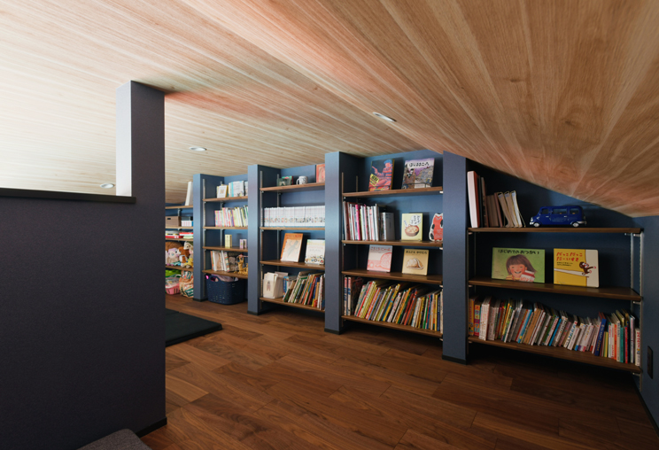 L字型ロフトは壁一面に造作本棚を設え、まるで図書館のように。当初は明るさ重視でアイアン手すりも検討したが、本の日焼けを防ぐために、壁にスリットを入れて採光するプランに変更。大切な蔵書を守りつつ、心地よい光と落ち着きを両立させた