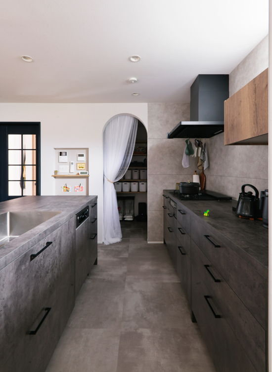 キッチンの壁には、ワークトップの色に合わせたグレーのキッチンパネルを採用。スタイリッシュなだけでなく、汚れが目立ちにくいという実用的なメリットも。木目調の吊り戸棚が、無機質になりがちな空間に温かみを添えている。アーチの奥のパントリーには、冷蔵庫と予備の冷凍庫まで置けるというから、その収納力は驚き