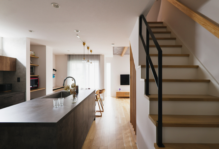 リビングに入って、まず目に飛び込んでくるのが、ひな壇状のリビング階段。空間をゆるやかに仕切りながら、オブジェのような存在感を放つ。黒いアイアンの手すりが、空間全体をきりりと引き締め、洗練された印象に。窓からの光が落とす、柔らかな陰影も美しい