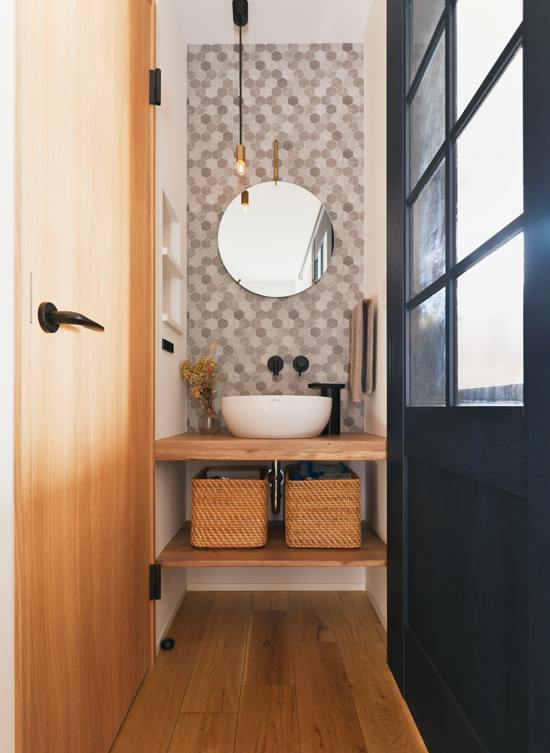 玄関脇にはコンパクトな手洗いコーナーを造作。下の棚は、市販のカゴがシンデレラフィットするよう計算された、こだわりの設計だ。壁のモザイクタイル調クロスや、夫人が持ち込んだというお気に入りの照明が空間を華やかに彩る