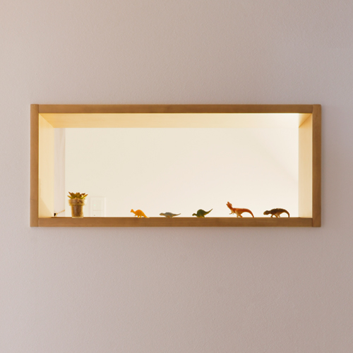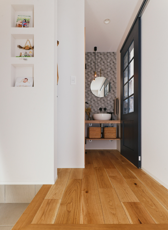 L字型の広々とした玄関は、家族みんなが同時に靴を履ける、ゆとりの設計。忙しい朝の「いってきます」が大渋滞、なんてこともない。壁に縦に並べた3つのニッチは、思い出の品を飾る小さなギャラリー。廊下には手洗いコーナーもあり、リビングに入る前の手洗い習慣が自然と身につく