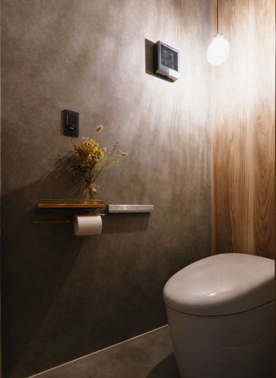 落ち着いたトーンでまとめた、シックなトイレ。質感豊かなグレーの壁紙に、ペンダントライトの光が落とす柔らかな陰影が美しい。予備のトイレットペーパーを隠せる棚も造作し、機能性と美観を両立。生活感を感じさせない、まるでホテルのような空間だ