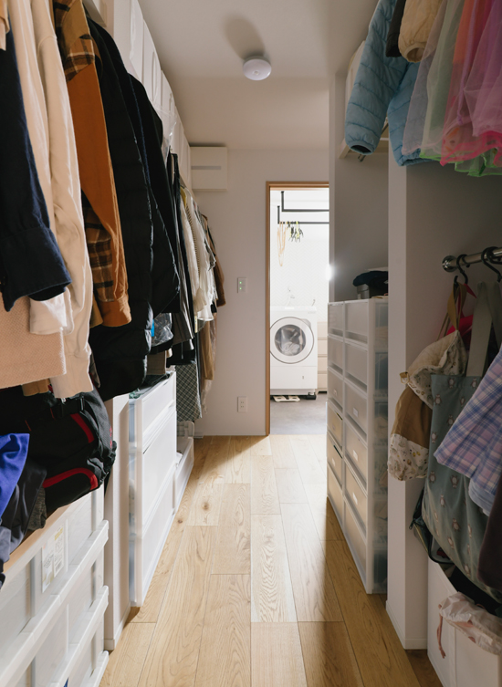 家族全員の衣類をまとめて収納する、ウォークスルーのファミリークローゼット。隣のランドリールームで乾かした洗濯物を、すぐにしまえるのが最大の魅力だ。廊下からランドリールーム、そしてクローゼットへと、ぐるりと回遊できる間取りが、洗濯という家事を驚くほどスムーズにしてくれる
