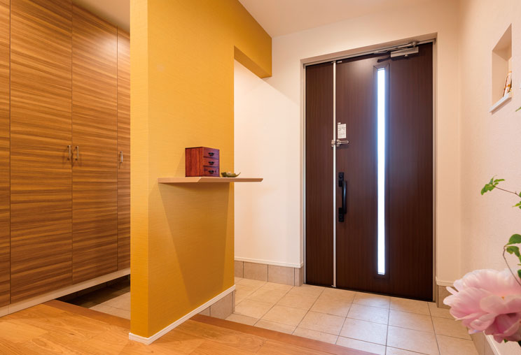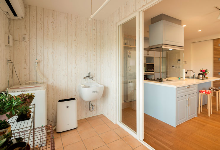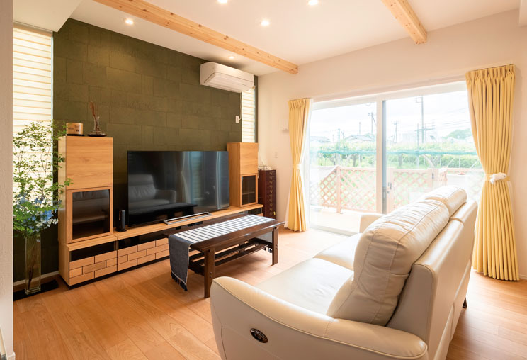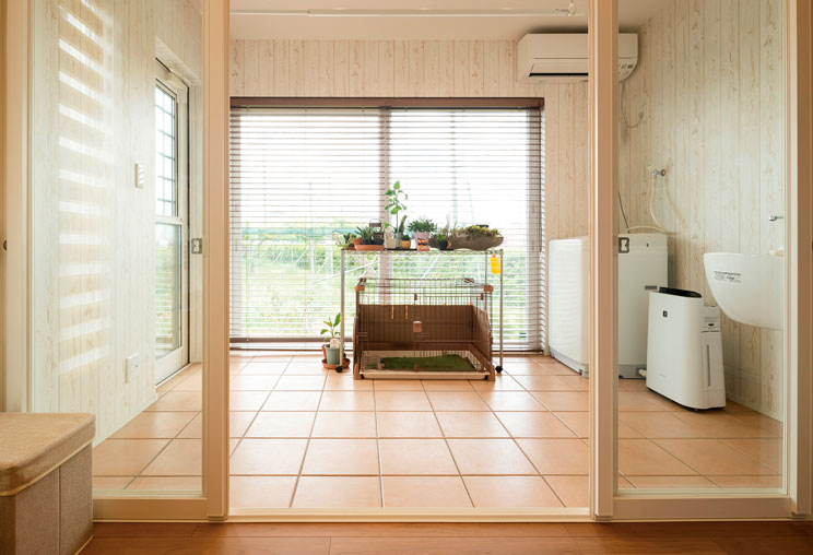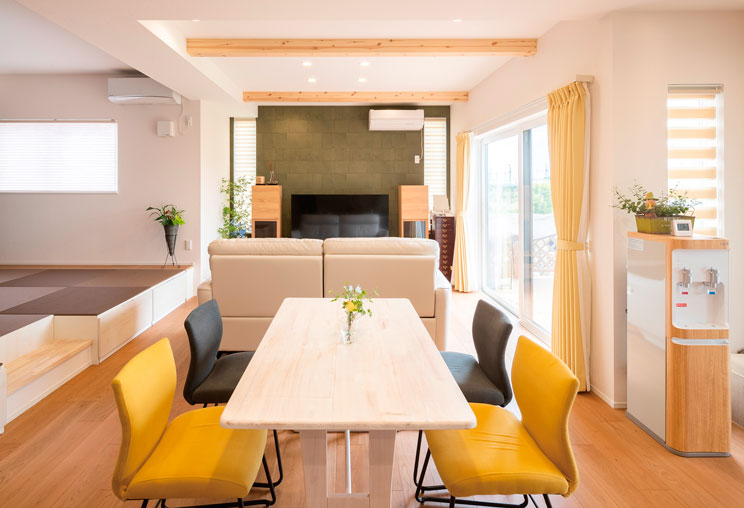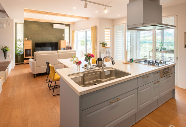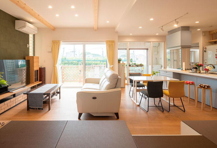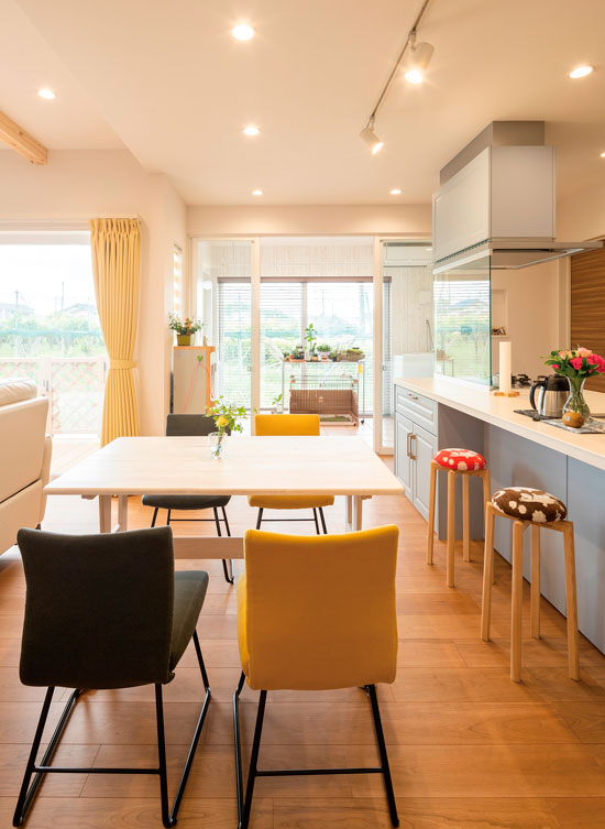 以前の住まいは、いわゆる「昔の家」。夫婦で暮らすにはあまりにも広く、老朽化で冬の寒さもつらかった。「今の自分たちにふさわしい住まいへ」と、Oさんは建て替えを決心。家づくりのパートナーは地元で知られるタインデザインを選んだ。夫婦の理想は、すみずみまで目が行き届くちょうどよいサイズ。また将来を考えて、バリアフリーの平屋を希望された。ふだんの暮らしは、庭いじりで外と中を行ったり来たりがメイン。そこで担当の水澤さんは、庭いじりの泥を室内に持ち込まずそのまま浴室に直行できる動線や、外と中をつなぐサンルームを実現。ご近所さんが集まることが多いということで、リビングとひと続きの和室もかなえた。フルフラットの対面キッチンからはフロア全体を見渡すことができ、作業しながらでもお客さんのおもてなしが可能。ダイニングとリビングと小上がりの和室と・・・居場所をたくさんつくったOさん邸は、多くのご近所さんが集まりそうだ。