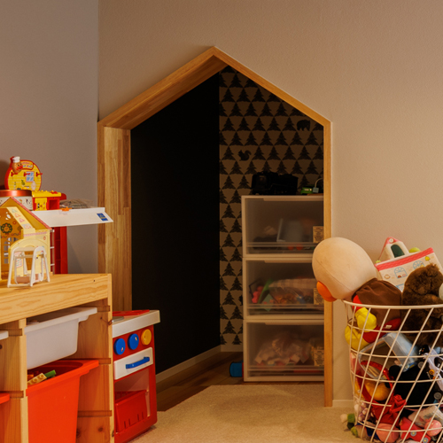 キッズスペースの奥につくった、家型の可愛らしいアーチ。その向こうには、たっぷりの収納スペースが広がっている。枠の部分には本物の木を使い、デザインのアクセントに。子どもたちの遊び心をくすぐる、楽しい仕掛けだ