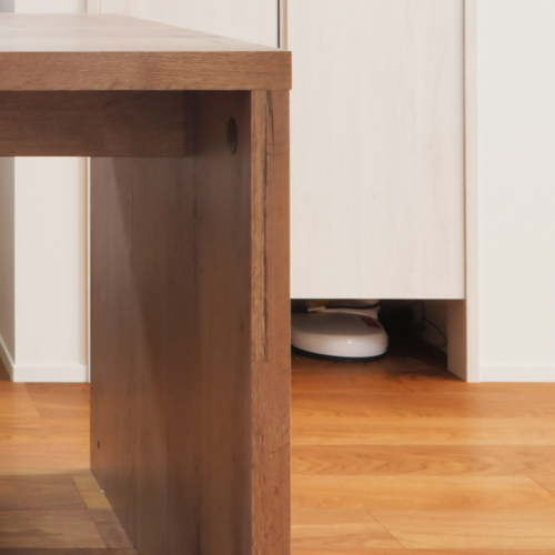 リビング収納の足元には、ロボット掃除機のための専用基地を。いつでもスムーズに出動・帰還できるよう、ぴったりサイズの空間を確保した。もちろん中で充電できるようコンセントも完備。空間をすっきりと見せながら日々の掃除を楽にしてくれる、縁の下の力持ちだ