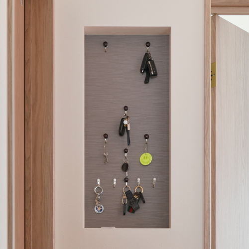 廊下の壁に設けた、鍵や眼鏡のためのニッチ。これはCさんのアイデアだ。出かける時に必ず通るこの場所に小物たちの指定席をつくることで、「あれ、どこに置いたかな?」がなくなる。忘れ物防止にも一役買う、実用的な工夫である