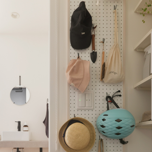 シューズインクローゼットの一角には、有孔ボードを使った見せる収納を。いつも使う帽子や鍵の定位置で、お出かけ前の「あれどこだっけ?」とは無縁。暮らしを便利にするちょっとした工夫が嬉しい