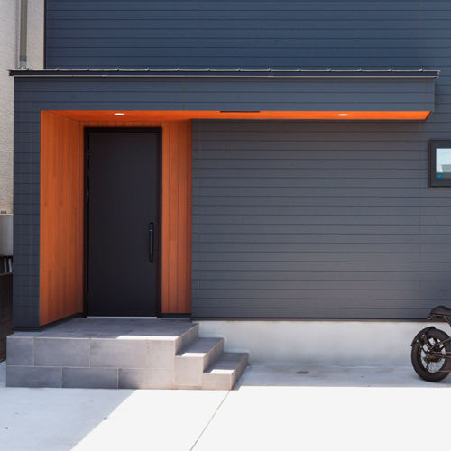 ガルバリウムのクールな外壁に、木の温かみをプラスした玄関アプローチ。軒天に埋め込まれたダウンライトが、夜には壁やドアを優しく照らし出し、昼間とは違う表情を見せてくれる