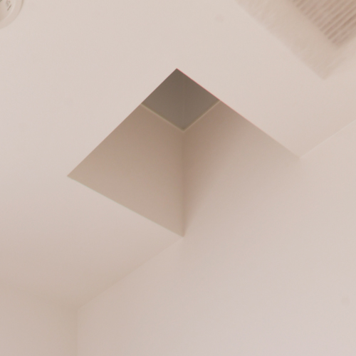 「エアコンの上部が吹き抜けの上から見えるのがイヤ」という夫人の要望に応え、位置を変えて天井埋め込みに