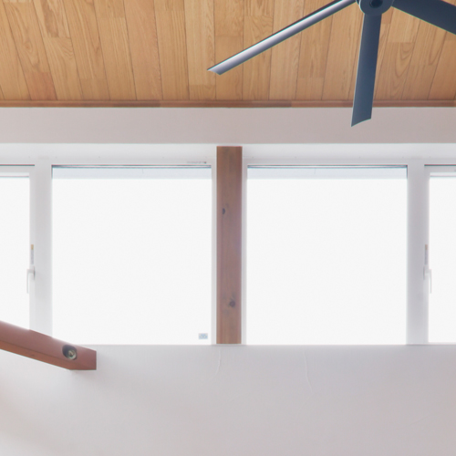 勾配天井に沿ってずらりと窓を配置。窓枠の形に切り取られた光が、室内に軽快なリズムをもたらしています
