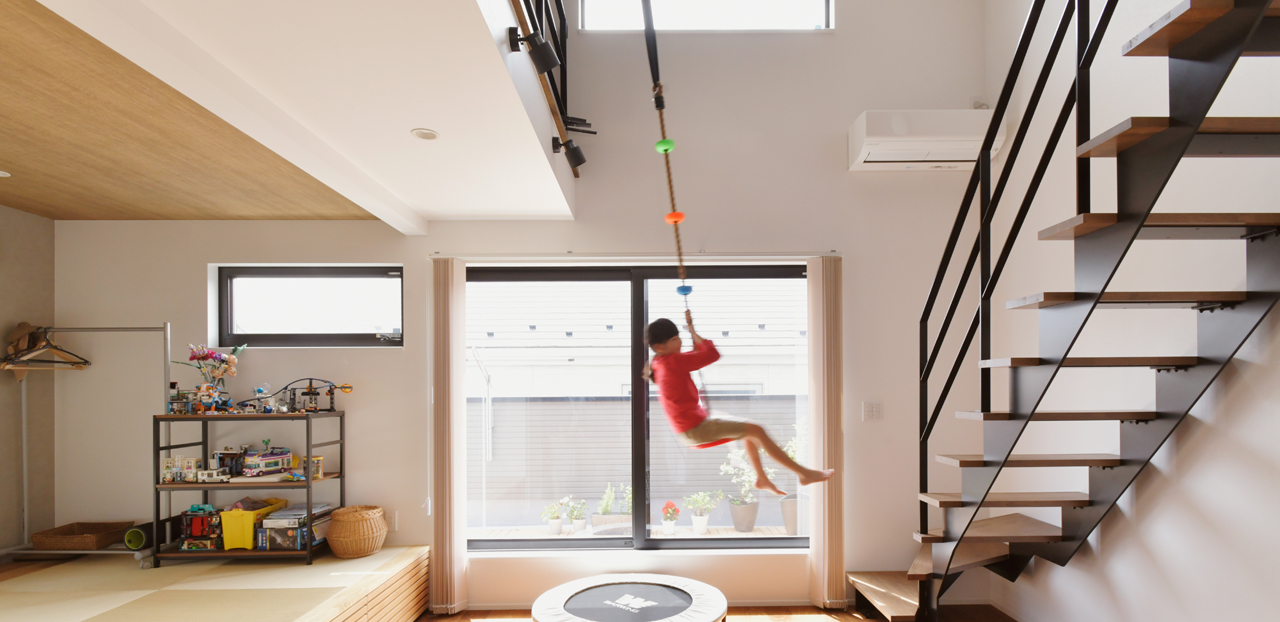 Oさん邸のコンセプトは「遊べる家」。 何といっても主役は、リビングの吹き抜けに張られたアスレチック...